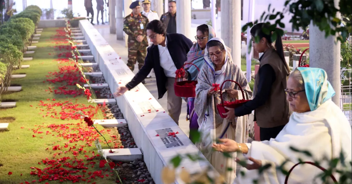 পুষ্পস্তবক অর্পণের পর তারা কিছুক্ষণ নীরবে দাঁড়িয়ে থাকেন। তারা সেখানে ফুলের পাপড়ি বিছিয়ে দেন।