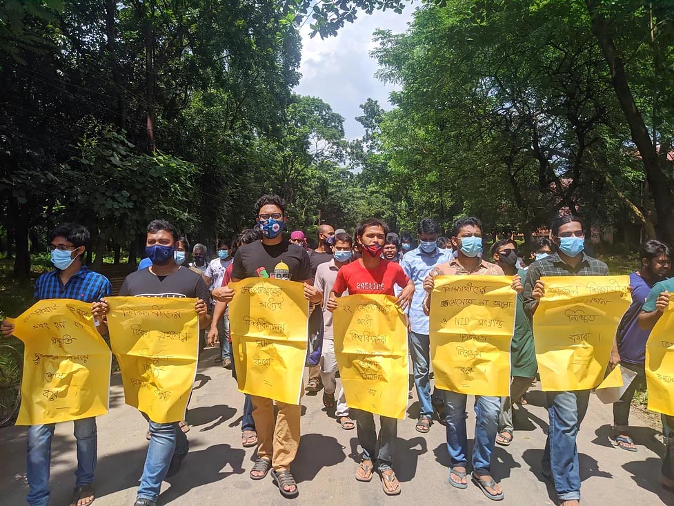 আবাসিক হল খুলে ক্যাম্পাস সচলের দাবিতে বিক্ষোভ মিছিল করেছেন জাহাঙ্গীরনগর বিশ্ববিদ্যালয়ের (জাবি) শিক্ষার্থীরা। বুধবার (১৫ সেপ্টেম্বর) বেলা ১২টায় বিশ্ববিদ্যালয়ের কলা ভবনের সামনে থেকে বিক্ষোভ মিছিল বের করা হয়। মিছিলটি বিশ্ববিদ্যালয়ের কয়েকটি সড়ক ঘুরে নতুন প্রশাসনিক ভবনের সামনে গিয়ে শেষ হয়। পরে সেখানে সংক্ষিপ্ত সমাবেশ করেন শিক্ষার্থীরা। সমাবেশে ছাত্র ইউনিয়নের বিশ্ববিদ্যালয় সংসদের সাধারণ সম্পাদক রাকিবুল রনি বলেন, গত দুই মাস ধরে বিশ্ববিদ্যালয় খোলার প্রস্তুতি নেওয়ার কথা বলা হচ্ছে। তারপরেও জাহাঙ্গীরনগর বিশ্ববিদ্যালয় খোলার ব্যাপারে আমরা কোনো অগ্রগতি দেখতে পাচ্ছি না। বিশ্ববিদ্যালয় প্রশাসনের প্রস্তুতি গ্রহণের ধরণ থেকে আমরা বুঝতে পারছি, যত বেশিদিন সম্ভব বিশ্ববিদ্যালয় বন্ধ রাখার পায়তারা চলছে। বিশ্ববিদ্যালয় খোলার কোনো বিকল্প নেই। আগামী ২২ সেপ্টেম্বরের মধ্যে বিশ্ববিদ্যালয় খোলার তারিখ ঘোষণা না করা হলে শিক্ষার্থীরা কর্মসূচি ঘোষণা করবে। সমাজতান্ত্রিক ছাত্র ফ্রন্ট জাবি শাখার আহ্বায়ক শোভন রহমান বলেন, মার্চ থেকে বলা হচ্ছে বিশ্ববিদ্যালয় শিক্ষার্থীদের টিকা প্রদানের পর বিশ্ববিদ্যালয় খুলে দেয়া হবে। বিশ্ববিদ্যালয় খুলে দেয়ার মাধ্যমে শিক্ষাপ্রতিষ্ঠান খোলার সূচনা হওয়ার কথা থাকলেও যাদের টিকা দেয় হয় নাই সেই শিক্ষার্থীদের জন্য শিক্ষা কার্যক্রম চালু হল। সেপ্টেম্বরের মধ্যে বিশ্ববিদ্যালয় চালু করতে হবে। অক্টোবর মাসের একটি দিনও আমরা বিশ্ববিদ্যালয়ের বাইরের আবাসন ব্যবস্থায় থাকতে চাই না। সমাজতান্ত্রিক ছাত্র ফ্রন্টের বিশ্ববিদ্যালয় শাখার সাধারণ সম্পাদক আবু সাঈদের সঞ্চালনায় সমাবেশে আরও বক্তব্য দেন ইতিহাস বিভাগের শিক্ষার্থী নুরুজ্জামান শুভ, নুসরাত ফারিন, দর্শন বিভাগের শিক্ষার্থী রিয়াজুল ইসলাম রিহান, ইংরেজি বিভাগের নূর-এ সুলতান রিফাত ও রসায়ন বিভাগের শিক্ষার্থী ইকবাল হোসাইন। সমাবেশের শেষে বিশ্ববিদ্যালয় খোলা ও ভ্যাকসিন জটিলতা নিরসনের দাবি নিয়ে বিশ্ববিদ্যালয়ের উপাচার্যের রুটিন দায়িত্বে থাকা অধ্যাপক নূরুল আলম বরাবর স্মারকলিপি দেন শিক্ষার্থীরা। অধ্যাপক নূরুল আলমের পক্ষে উপাচার্যের একান্ত সচিব ডেপুটি রেজিস্ট্রার সানোয়ার হোসেন স্মারকলিপি গ্রহণ করেন।