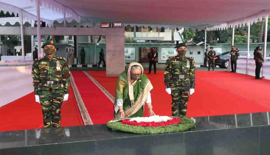 পরে আওয়ামী লীগের জ্যেষ্ঠ ও কেন্দ্রীয় নেতাদের সঙ্গে নিয়ে দলের পক্ষ থেকে বঙ্গবন্ধুর প্রতিকৃতিতে আরেকটি পুষ্পস্তবক অর্পণ করেন শেখ হাসিনা।