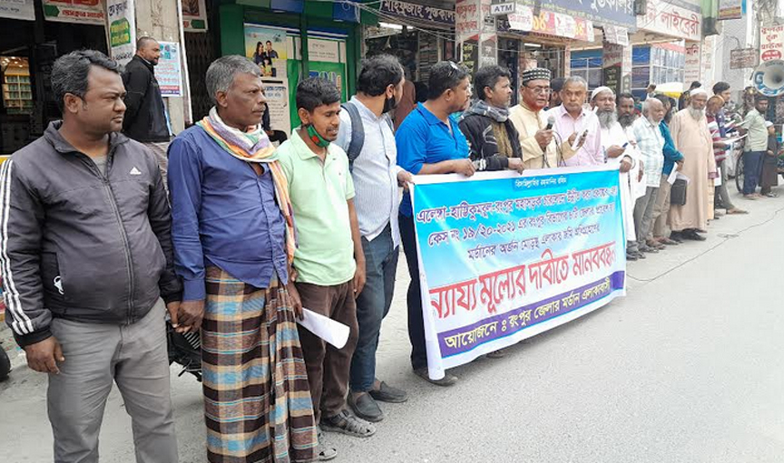 এলেঙ্গা-হাট্টিকুমরুল-রংপুর মহাসড়ক চারলেনে উন্নীত করণ প্রকল্পের এলএ কেস নং ১৯/২০-২০২১ এর রংপুর বিভাগের ৮টি জেলার প্রবেশ দ্বার মর্ডানের অর্জন মোড়স্থ এলাকার জমি অধিগ্রহণের ন্যায্য মূল্যে পাওয়ার দাবিতে এলাবাসী মানববন্ধন কর্মসূচী পালন করেছে। সোমবার (১১ মার্চ) সকালে নগরীর প্রেসক্লাব চত্বরে উক্ত মানববন্ধন কর্মসূচী অনুষ্ঠিত হয়।