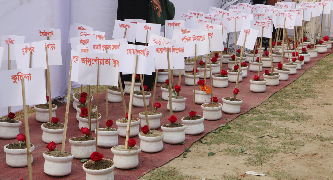 সোমবার সকালে শহরের মুক্তির মোড়ে শহীদ মুক্তিযোদ্ধা স্মৃতিস্তম্ভের পাশে এভাবে এ শ্রদ্ধা জানানো হয়। সেখানে ১৩২টি গণহত্যার স্থানের মাটি সংগ্রহ করে আলাদা আলাদা পাত্রে রেখে তাতে গোলাপ ফুল দিয়ে শ্রদ্ধা জানানো হয়।