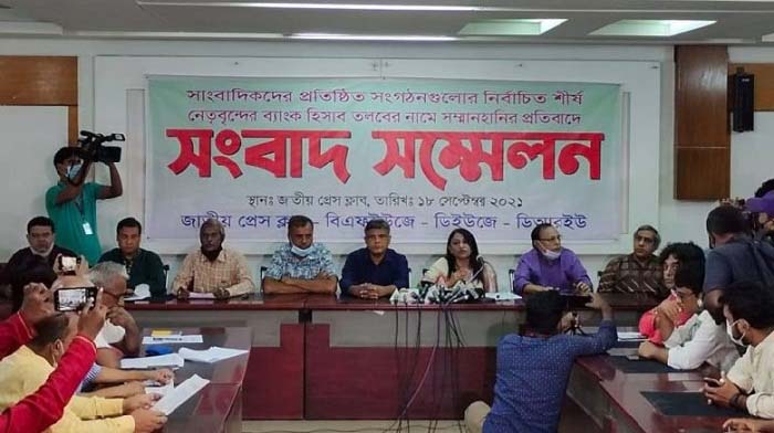 দেশের সাংবাদিকদের সংগঠনগুলোর শীর্ষ ১১ নেতার ব্যাংক হিসাব তলব করেছে বাংলাদেশ ফাইনান্সিয়াল ইন্টেলিজেন্স ইউনিট (বিএফআইইউ)। এর প্রতিবাদে সংবাদ সম্মেলন করেছেন সংশ্লিষ্ট ওই নেতারা। শনিবার (১৮ সেপ্টেম্বর) জাতীয় প্রেসক্লাবে আয়োজিত এক সংবাদ সম্মেলনে তারা বলছেন, সাংবাদিক নেতাদের ব্যাংক হিসাব তলবের ঘটনা স্বাধীন সাংবাদিকতার জন্য হুমকি। অনুষ্ঠানে সাংবাদিকদের শীর্ষ ১১ নেতার পক্ষে লিখিত বক্তব্য পাঠ করেন ঢাকা রিপোর্টাস ইউনিটির (ডিআরইউ) সাধারণ সম্পাদক মসিউর রহমান খান। এ সময় উপস্থিত ছিলেন, জাতীয় প্রেসক্লাবের সভাপতি ফরিদা ইয়াসমিন, সাধারণ সম্পাদক ইলিয়াস খান, বাংলাদেশ ফেডারেল সাংবাদিক ইউনিয়নের (বিএফইউজে) একাংশের সভাপতি মোল্লা জালাল, ভারপ্রাপ্ত মহাসচিব আবদুল মজিদ, বিএফইউজে’র অপরাংশের সভাপতি এম. আবদুল্লাহ, মহাসচিব নুরুল আমিন রোকন, ঢাকা সাংবাদিক ইউনিয়ন (ডিইউজে) একাংশের সভাপতি কাদের গনি চৌধুরী, সাধারণ সম্পাদক শহিদুল ইসলাম এবং ঢাকা রিপোর্টার্স ইউনিটির সভাপতি মুরসালিন নোমানী ও সাধারণ সম্পাদক মসিউর রহমান খান। তাদের প্রত্যেকের ব্যাংক হিসাব তলব করেছে বিএফআইইউ। সারাদেশের সাংবাদিকদের প্রতিনিধিত্বকারী সংগঠনগুলোর নির্বাচিত শীর্ষ নেতাদের নাম ও প্রতিষ্ঠানকে একীভূত করে ঢালাওভাবে তাদের ব্যাংক হিসাব তলবের ঘটনায় সারাদেশের সাংবাদিকদের মনে গভীর উদ্বেগ উৎকন্ঠার সৃষ্টি হয়েছে দাবি করে লিখিত বক্তব্যে বলা হয়, দেশের পেশাদার সাংবাদিকদের প্রতিষ্ঠিত সংগঠনগুলোর নির্বাচিত শীর্ষ নেতাদের ব্যাংক হিসাব এভাবে তলব করা বাংলাদেশের ইতিহাসে একটি নজিরবিহীন ঘটনা। কেননা এর আগে কোনোদিন কোনও সময়ে এমন ঘটনা ঘটেনি। কোনও ব্যক্তি বা প্রতিষ্ঠানের বিরুদ্ধে সুনির্দিষ্ট অভিযোগের তদন্ত হতেই পারে। কিন্তু সাংবাদিকতা পেশায় প্রতিষ্ঠিত সংগঠনসমূহের নির্বাচিত শীর্ষ নেতাদের নামে ঢালাওভাবে এ ধরনের পদক্ষেপ উদ্দেশ্যমূলক বলে আমরা মনে করি। নির্বাচিত শীর্ষ নেতাদের ব্যাংক হিসাব তলবের মাধ্যমে সাংবাদিকদের সব সংগঠন, প্রতিষ্ঠান ও সাংবাদিকতা পেশাকে জনমনে প্রশ্নবিদ্ধ করা হয়েছে। এ সময় এক প্রশ্নের জবাবে বিএফইউজে’র সভাপতি মোল্লা জালাল বলেন, ব্যাংক হিসাব তলবের ঘটনা স্বাধীন সাংবাদিকতার জন্য হুমকি। উপস্থিত সাংবাদিকদের উদ্দেশে নেতারা বলেন, অতীতে সাংবাদিকদের বিভিন্ন সমস্যা সমাধানের লড়াই-সংগ্রাম, নির্যাতন-নিপীড়ন ও গণমাধ্যমের বিভিন্ন সংকটে আপনারা আমাদের পাশে থেকেছেন। বর্তমান পরিস্থিতিতেও আমরা আপনাদের পাশে চাই। সাংবাদিকদের সুরক্ষা, স্বাধীনতা ও মর্যাদার প্রশ্নে কোনও ধরনের হুমকি-ধামকিতে আমরা অতীতে যেমন পিছপা হইনি, ভবিষ্যতেও হবো না। আগামীদিনে যেসব কর্মসূচি দেওয়া হবে তা সফল কর