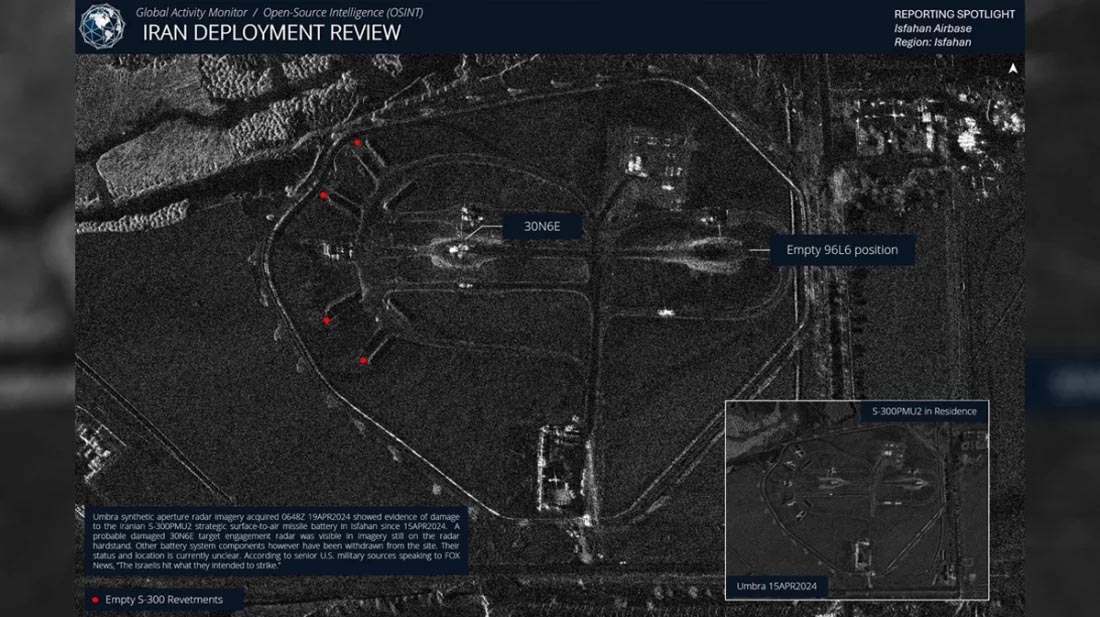 ইরানে ড্রোন ও ক্ষেপণাস্ত্র দিয়ে হামলা চালানো হয়েছে এমন একটি অঞ্চলের স্যাটেলাইট চিত্র বিশ্লেষণ করেছে নিউইয়র্ক টাইমস ও বিবিসি। হামলাগুলো যুদ্ধবিমান থেকে চালানো হয়েছে বলে জানা গেছে। স্যাটেলাইট চিত্রে ইস্পাহান আন্তর্জাতিক বিমানবন্দরের উত্তর-পূর্বে অবস্থিত রুশ অরিজিন ভূমি থেকে আকাশে নিক্ষেপযোগ্য ‘এস-৩০০’ অ্যান্টি-ব্যালিস্টিক ক্ষেপণাস্ত্র প্রতিরক্ষা ব্যবস্থার ব্যাটারি দেখা গেছে। ছবিগুলোতে ১৫ এপ্রিল গোপন সুবিধায় অবস্থিত এস-৩০০ প্রতিরক্ষা ব্যবস্থাকে দেখা গেছে। ১৯ এপ্রিল থেকে গুগল আর্থের সর্বশেষ ছবিতে স্থানটিকে খালি দেখাচ্ছে।