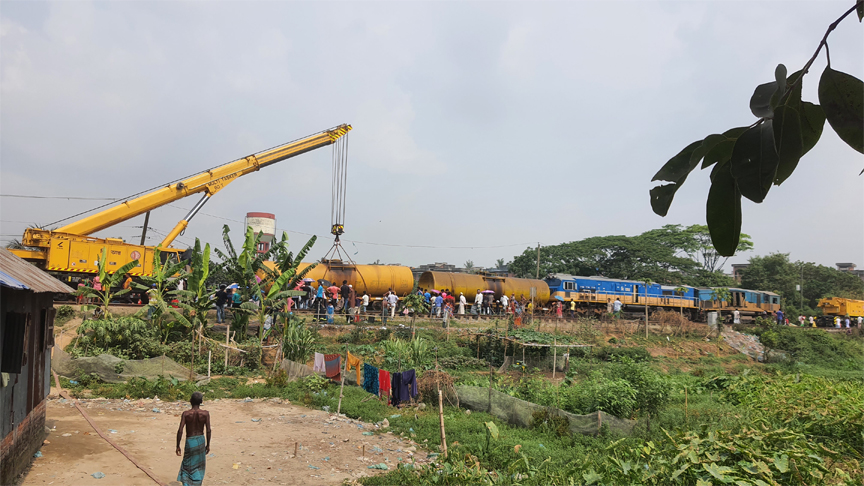 শনিবার সকাল ১০টা পর্যন্ত তেলবাহী ট্রেনের দুটি ওয়াগন ও দুই ট্রেনের ইঞ্জিনদুটি উদ্ধার এখনও বাকি।