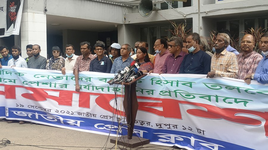 জাতীয় প্রেস ক্লাবের সভাপতি-সম্পাদক, ডিইউজে ও বিএফইউজের সভাপতি-সাধারণ সম্পাদকসহ ১১ সাংবাদিক নেতার ব্যাংক হিসাব তলবের প্রতিবাদে সমাবেশ করছে সাংবাদিক সংগঠনগুলো। রোববার (১৯ সেপ্টেম্বর) দুপুর ১২টায় জাতীয় প্রেস ক্লাবের সামনে এই সমাবেশের আয়োজন করা হয়। জাতীয় প্রেস ক্লাব, বাংলাদেশ ফেডারেল সাংবাদিক ইউনিয়ন (বিএফইউজে), ঢাকা সাংবাদিক ইউনিয়ন (ডিইউজে), ঢাকা রিপোর্টার্স ইউনিটি (ডিআরইউ) এই সমাবেশের আয়োজন করে। ঢাকা ডিআরইউয়ের সাধারণ সম্পাদক মশিউর রহমানের সঞ্চালনায় সমাবেশে বক্তব্য রাখছেন সাংবাদিক নেতারা। এর আগে গত ১২ সেপ্টেম্বর ১১ সাংবাদিক নেতার তথ্য চেয়ে তফসিলি ব্যাংকগুলোতে চিঠি পাঠায় কেন্দ্রীয় ব্যাংকের নিয়ন্ত্রণাধীন বাংলাদেশ ফাইন্যান্সিয়াল ইন্টেলিজেন্স ইউনিট (বিএফআইইউ)। বিএফআইইউয়ের চিঠিতে সাংবাদিক নেতাদের জাতীয় পরিচয়পত্র ও পাসপোর্ট নম্বর দেওয়া হয়েছে। বলা হয়েছে, তাদের হিসাবের যাবতীয় তথ্য (হিসাব কবে খোলা হয়েছে, সেই হিসাব খোলার ফরম, হিসাবে টাকা জমা-উত্তোলনসহ লেনদেন বিবরণী এবং হিসাবে স্থিতি) আগামী চার কর্মদিবসের মধ্যে বিএফআইইউ বরাবর পাঠাতে বলা হয়েছে। ব্যাংক হিসাব তলব করা সাংবাদিক নেতাদের মধ্যে রয়েছেন জাতীয় প্রেস ক্লাবের সভাপতি ফরিদা ইয়াসমিন, সাধারণ সম্পাদক ইলিয়াস খান, ঢাকা সাংবাদিক ইউনিয়নের সভাপতি (বিএনপি সমর্থিত) আবদুল কাদের গণি চৌধুরী ও সাধারণ সম্পাদক মো. শহিদুল ইসলাম, ঢাকা সাংবাদিক ইউনিয়ন (আওয়ামী লীগ সমর্থিত) সাধারণ সম্পাদক সাজ্জাদ আলম খান তপু, বাংলাদেশ ফেডারেল সাংবাদিক ইউনিয়নের (বিএনপি সমর্থিত) সভাপতি এম আব্দুল্লাহ, মহাসচিব নুরুল আমিন রোকন, বাংলাদেশ ফেডারেল সাংবাদিক ইউনিয়নের সভাপতি (আওয়ামী লীগ সমর্থিত) মোল্লা জালাল, ভারপ্রাপ্ত মহাসচিব আবদুল মজিদ, ঢাকা রিপোর্টার্স ইউনিটির সভাপতি মোরসালীন নোমানী এবং সাধারণ সম্পাদক মশিউর রহমান খান।