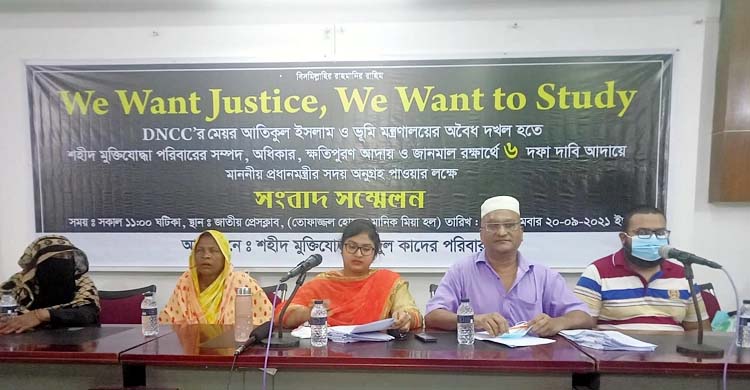 ঢাকা উত্তর সিটি করপোরেশনের (ডিএনসিসি) মেয়র আতিকুল ইসলামের পদত্যাগ ও ভূমি মন্ত্রণালয়ের অবৈধ দখল, ক্ষতিপূরণ আদায় ও জানমালের নিরাপত্তা চেয়ে সংবাদ সম্মেলন করেছে বীর মুক্তিযোদ্ধা শহীদ আবদুল কাদেরের পরিবার। গতকাল সোমবার বেলা ১১টায় জাতীয় প্রেস ক্লাবের তফাজ্জল হোসেন মানিক মিয়া হলে এ সংবাদ সম্মেলনের আয়োজন করা হয়। সংবাদ সম্মেলনে লিখিত বক্তব্য পাঠ করেন বীর মুক্তিযোদ্ধা আবদুল কাদেরের নাতনি নুরতাজ আরা ঐশী। তিনি বলেন, মেয়র আতিক একজন আইন অমান্যকারী। দেশের প্রচলিত আইন-কানুনের তিনি তোয়াক্কা করেন না। তার আচরণ ও বডি ল্যাঙ্গুয়েজ মাফিয়া প্রধানের মতো। আমার বাবাকে তিনি রাজনৈতিক প্রতিদ্বন্দ্বী মনে করেন বলেও দাবি করেন ঐশী। লিখিত বক্তব্যে তিনি আরও বলেন, আমাদের কলমিলতা বাজারের মীমাংসিত ক্ষতিপূরণ দেওয়ার বিষয়টি ইচ্ছাকৃতভাবে তিনি তার (মেয়র আতিক) দলবল নিয়ে ক্ষমতার অপব্যবহার করে আমাদের পাওনা চার হাজার কোটি টাকার ক্ষতিপূরণ না দিয়ে বেআইনিভাবে অনেক দিন আটকে রেখেছেন। এছাড়াও প্রয়াত মেয়র আনিসুল হক স্থানীয় সরকার মন্ত্রণালয়ের প্রশাসনিক অনুমোদন নিয়ে আদালতের রায় মেনে ২০১৭ সালে ভূমি মন্ত্রণালয়ের মাধ্যমে ঢাকা জেলা প্রশাসককে আমাদের ক্ষতিপূরণ দেওয়ার প্রস্তাব পাঠান। কিন্তু বর্তমান মেয়র আতিক আমাদের ক্ষতিপূরণ দেওয়ার বিষয়টি একেবারেই অবজ্ঞা করে চলেছেন। এসময় তাদের পরিবারকে নিঃশেষ করে দেওয়া, চিকিৎসা ও স্বাভাবিক জীবনযাপন নির্মম, নির্দয় ও অমানবিকভাবে ব্যাহত করছে বলে দাবি করেন তিনি। আতিকুল ইসলামকে ‘অমানবিক মেয়র’ উল্লেখ করে তার পদত্যাগ দাবি করেন ঐশী। ভূমি মন্ত্রণালয়ের অবৈধ দখলের বিষয়ে তিনি জানান, প্রতিনিয়ত আমাদের নির্মাণাধীন ফ্ল্যাট ও অন্যান্য সম্পদের লুটপাট করছে। তাছাড়া প্রতিবেশীদের প্রকল্পের নির্ধারিত ভূমি দখল করে নেওয়ার জন্যও উৎসাহিত করছে বলে দাবি করেন তিনি। পরে ভাষানটেক পুনর্বাসন প্রকল্প বাস্তবায়ন ও মুক্তিযোদ্ধা পরিবারের জানমাল ও সম্পদের সুরক্ষাসহ ছয়টি দাবি তুলে ধরেন ঐশী। সংবাদ সম্মেলনের শেষে এক প্রশ্নের জবাবে বীর মুক্তিযোদ্ধা আবদুল কাদেরের ছেলে মো. আবদুর রহিম বলেন, আমাদের প্রাপ্য ক্ষতিপূরণ তারা দিচ্ছে না। এমনকি আমাদের বিভিন্ন সময় হুমকি-ধমকি দিচ্ছে তারা। আমরা এ বিষয়ে শিগগিরই আইনের আশ্রয় নেবো।