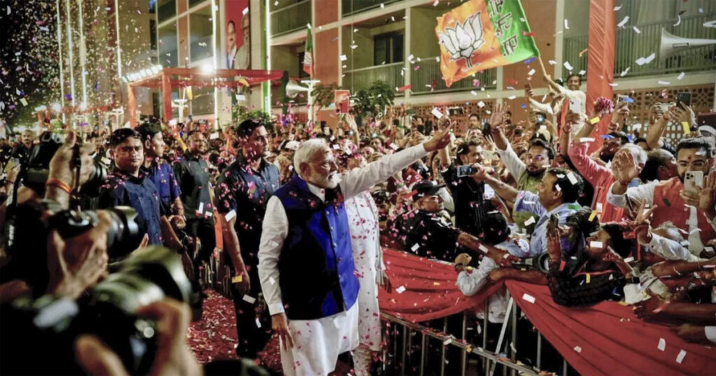 বিজেপি নেতৃত্বাধীন জোট এনডিএর সঙ্গে লোকসভা নির্বাচনে বিজয়ী হওয়ার ঘোষণা দিয়েছেন ভারতের প্রধানমন্ত্রী নরেন্দ্র মোদি। গত নির্বাচনের তুলনায় কংগ্রেস নেতৃত্বাধীন বিরোধী জোট ইন্ডিয়ার কাছে বেশ কিছু আসন হারানোর পরও টানা তৃতীয় মেয়াদে সরকার গঠনের পথে মোদি।