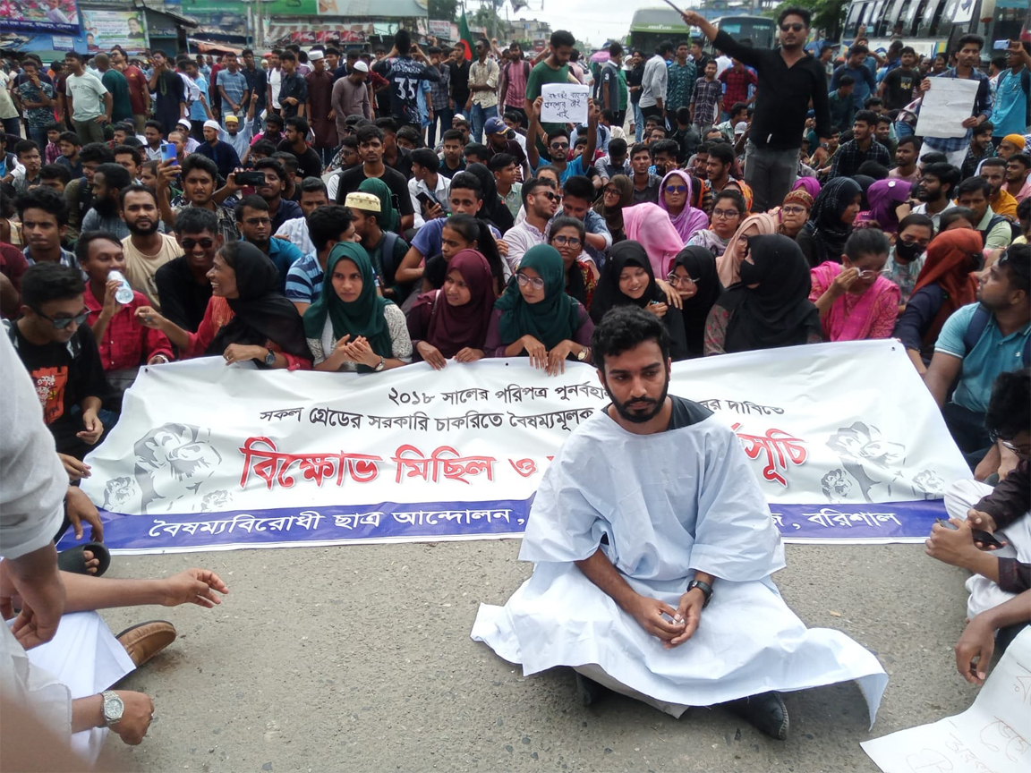 সরকারি চাকরিতে বৈষম্যমূলক কোটা পদ্ধতি বাতিলের দাবিতে বরিশাল বিশ্ববিদ্যালয় (ববি) ও বিএম কলেজের শিক্ষার্থীরা ঢাকা-বরিশাল মহাসড়ক অবরোধ করে বিক্ষোভ করছে।