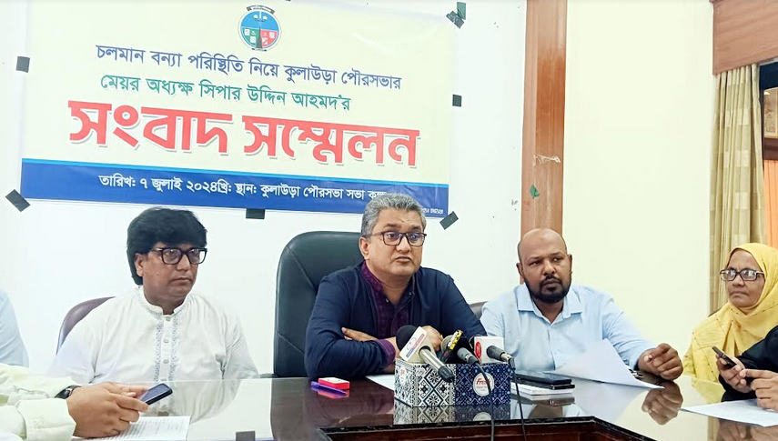 সংবাদ সম্মেলনে লিখিত বক্তব্যে পৌর মেয়র অধ্যক্ষ সিপার উদ্দিন আহমদ বলেন, গত ১৭ জুন থেকে কুলাউড়া উপজেলার অধিকাংশ এলাকা বন্যায় প্লাবিত হয়ে যায়। একইভাবে কুলাউড়া পৌরসভার একটি বড় অংশ বন্যার পানিতে প্লাবিত হয়। তাৎক্ষণিকভাবে রাবেয়া আদর্শ সরকারি প্রাথমিক বিদ্যালয় ও ইয়াকুব তাজুল মহিলা ডিগ্রি কলেজে ২টি আশ্রয়কেন্দ্র খোলা হয়। পরবর্তীতে সী-বার্ড কেজি স্কুল ও বিএইচ সরকারি প্রাথমিক বিদ্যালয়ে আরও ২টি আশ্রয়কেন্দ্র খোলা হয়। ওই ৪টি আশ্রয়কেন্দ্রে ১১৯টি পরিবারের ৪০০ জন্য বন্যা দুর্গত মানুষ আশ্রয় নিয়েছেন। আশ্রয়কেন্দ্র ছাড়া আরও ২৫০০ পরিবারের ১০ হাজার লোক পানিবন্দি হয়ে পড়ে। একটানা ২১দিন যাবত মানুষজন বাসা-বাড়িতে ও বিভিন্ন আশ্রয়কেন্দ্রে পানিবন্দি অবস্থায় মানবেতর জীবন যাপন করছে। বিশুদ্ধ খাবার পানির সংকট, রান্না বান্না করতে পারছে না, টয়লেট ব্যবহার করতে পারছে না।