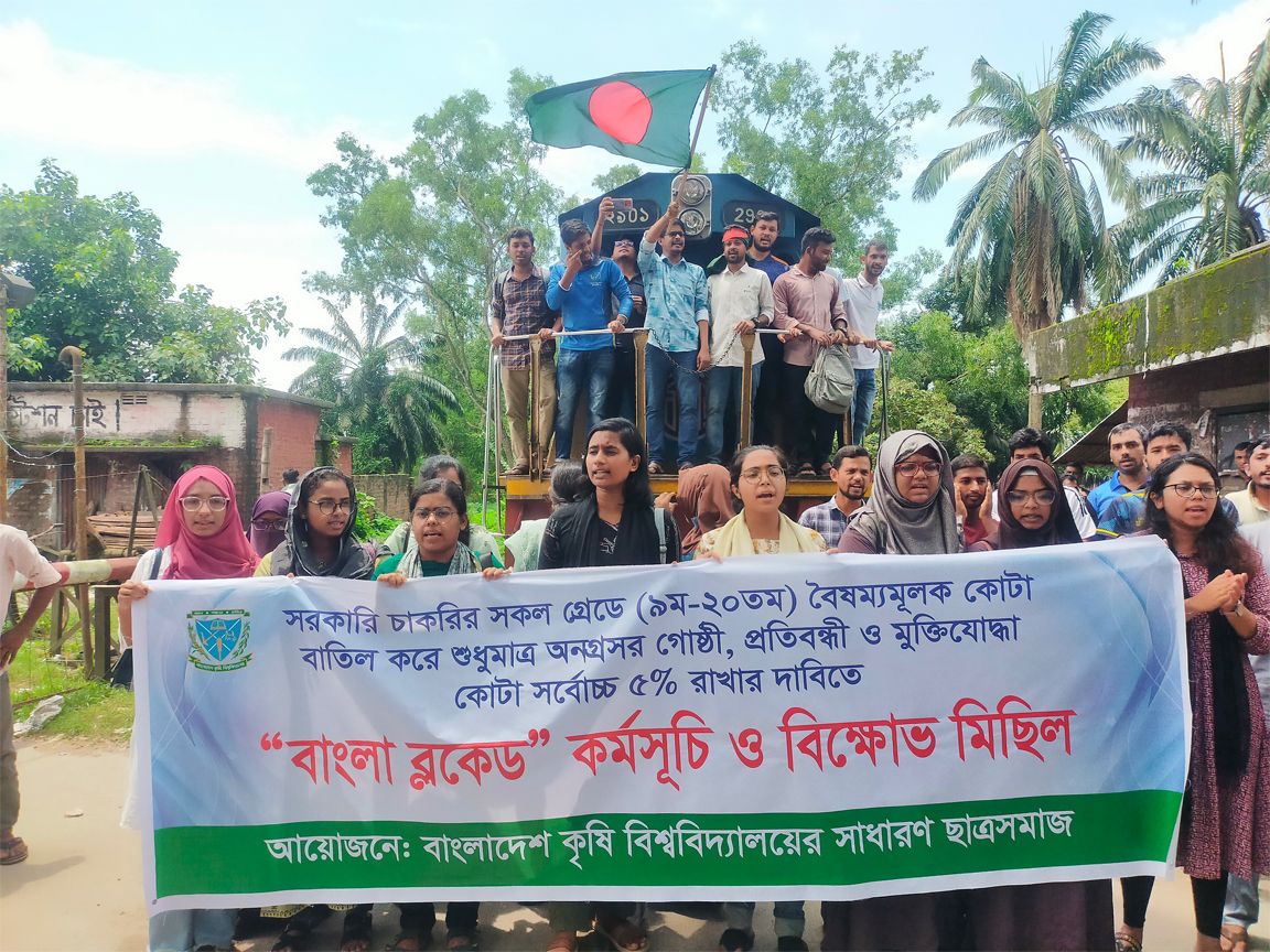কোটা সংস্কারের দাবি মেনে নিতে সরকারের ওপর চাপ সৃষ্টি করতে বুধবার সকাল ১০টা থেকে সন্ধ্যা পর্যন্ত দেশব্যাপী ‘বাংলা ব্লকেড’ কর্মসূচি পালনের ঘোষণা দিয়েছে কোটা সংস্কার আন্দোলনকারীরা। এই কর্মসূচির সঙ্গে একাত্মতা প্রকাশ করেছে বাংলাদেশ কৃষি বিশ্ববিদ্যালয়ের (বাকৃবি) শিক্ষার্থীরা।