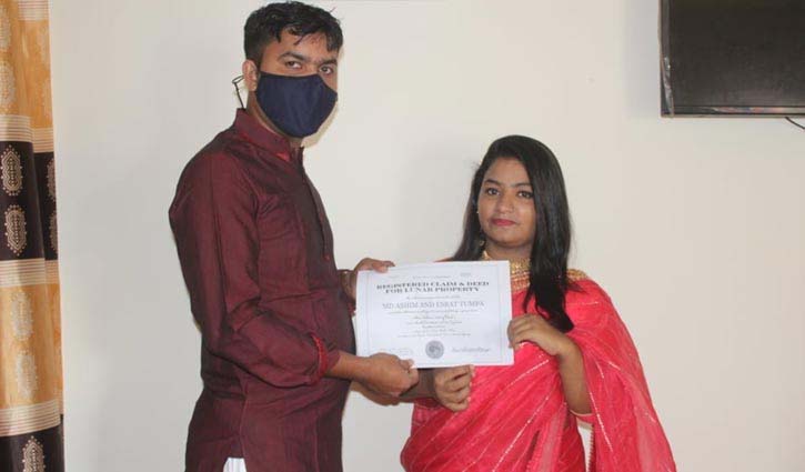 বৃহস্পতিবার ওই দম্পতির ষষ্ঠ বিয়ে বার্ষিকীতে স্ত্রী ইসরাত টুম্পার হাতে জমির দলিল তুলে দেন স্বামী এমডি অসীম।