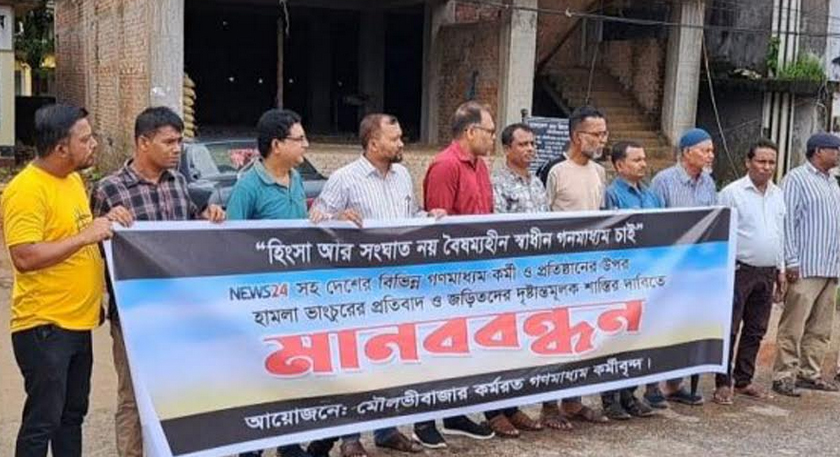 ইস্ট ওয়েস্ট গ্রুপে হামলার প্রতিবাদে মৌলভীবাজারে মানববন্ধন ও প্রতিবাদ সমাবেশ
