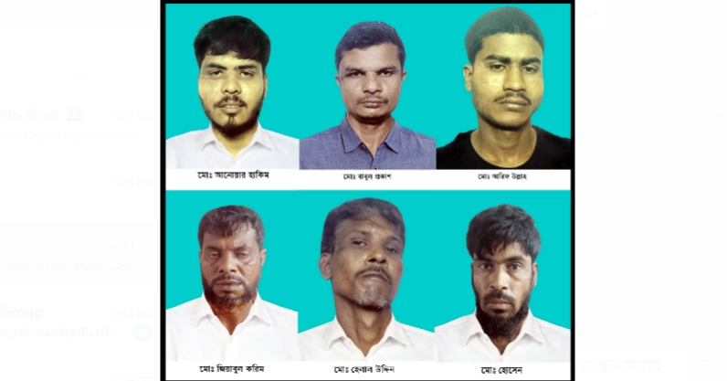 প্রাথমিক জিজ্ঞাসাবাদে জানা গেছে, আটকদের মধ্যে চারজন সরাসরি অপরাধের সঙ্গে জড়িত ছিল, বাকি দুজন গুরুত্বপূর্ণ তথ্য দিয়ে সহায়তা করেছিল। গ্রেপ্তাররা হলেন- মো. বাবুল প্রকাশ (৪৪), মো. হেলাল উদ্দিন (৩৪), মো. আনোয়ার হাকিম (২৮), মো. আরিফ উল্লাহ (২৫), মো. জিয়াবুল করিম (৪৫) ও মো. হোসেন (৩৯)।