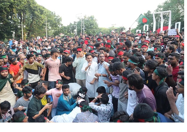 রাষ্ট্রপতির পদত্যাগের দাবিতে শহীদ মিনারে বেলা তিনটা থেকে প্রতিবাদ সভা শুরু হয়। এই সভা থেকে রাষ্ট্রপতি মো. সাহাবুদ্দিনের বিরুদ্ধে সাবেক প্রধানমন্ত্রী শেখ হাসিনার পদত্যাগ নিয়ে মিথ্যাচার করে শপথ ভঙ্গের অভিযোগ করা হয়। বিকেল পৌনে চারটার দিকে বৈষম্যবিরোধী ছাত্র আন্দোলনের সমন্বয়ক সারজিস আলম সেখানে যোগ দেন। সে সময় অন্য সমন্বয়কেরা কিছুটা দূরে অবস্থান করছিলেন। সেখানে বেশ কিছুক্ষণ শেখ হাসিনা, রাষ্ট্রপতি, আওয়ামী লীগ, ছাত্রলীগ ও যুবলীগের বিরুদ্ধে নানা স্লোগান দেওয়া হয়। পরে সমন্বয়কেরা সেখানে বক্তব্য দিতে শুরু করেছেন।