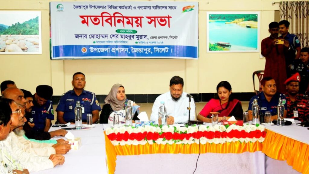 মঙ্গলবার (৫ নভেম্বর) সকালে জৈন্তাপুর উপজেলা পরিষদ হলরুমে প্রশাসন আয়োজিত এই মতবিনিময় সভা অনুষ্ঠিত হয়েছে।