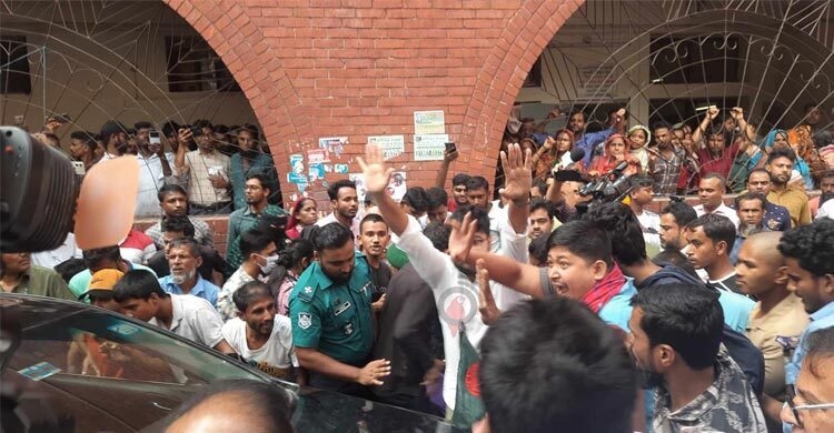 এক পর্যায়ে আন্দোলনে আহতদের একজন গাড়ির সামনে বসে পড়েন। আরেকজন উঠে পড়েন গাড়ির ওপর। কিছু সময় তারা গাড়িতে কিল-ঘুসি মেরে ক্ষোভ দেখাতে থাকেন। নেমে আসতে বলেন গাড়িচালকসহ অন্যদের।
