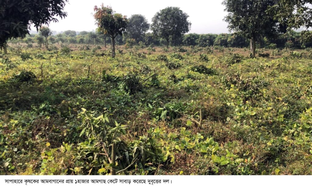 এবিষয়ে বাগান মালিক উপজেলার খোট্রাপাড়া গ্রামের মৃত বাশের মন্ডল এর পুত্র মো: আশরাফুল ইসলামের থানায় দায়েরকৃত অভিযোগ সূত্রে জানা গেছে। স্থানীয় এক লোকের অর্থ আত্নসাত মামলায় আসামীদের বিরুদ্ধে সাক্ষী দিতে আগ্রহ প্রকাশ করায় খোট্টাপাড়া গ্রামের মৃত নজিমুদ্দীন এর পুত্র মো: আলম (৩২) ও তার আপন ভাই মো: ফারুক হোসেন (৪৫) আশরাফুলের প্রতি ক্ষিপ্ত হয়ে বিভিন্ন ধরনের হুমকী প্রদান করেন এবং গত ২২নভেম্বর রাতের অন্ধকারে তারা অজ্ঞাতনামা বেশ কিছু জনতায় দলবদ্ধ হয়ে শাহাবাজপুর মৌজায় তার লীজকৃত ৫বিঘা জমির উপর তৈরীকৃত বারী-৪ জাতের আম বাগানে প্রবেশ করে বাগানে রোপিত ২বছর বয়সী ৯শ ৭০টি বারী-৪ জাতের আম গাছ কেটে অপুরনীয় ক্ষতি সাধন করে। এবারে ওই বাগান হতে আম বিক্রয় করে আশরাফুল লীজের টাকা পরিশোধ করার আশা করেছিল। কিন্ত শত্রুর দল তার সে আশায় বাধসেধে বসল। সংবাদ পেয়ে রবিবার বেলা সাড়ে ১১টার দিকে সরেজমিনে আশরাফুল ইসলামের বাগানে গিয়ে অসংখ্য কাটা আম গাছ বাগানের জমিতে পড়ে থাকতে দেখা যায়।
