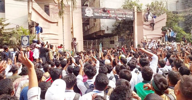 পূর্বঘোষিত কর্মসূচি অনুযায়ী রোববার (২৪ নভেম্বর) দুপুর ১টার দিকে ঢাকার ৩৫টিরও বেশি কলেজের শিক্ষার্থী ন্যাশনাল মেডিকেল ইনস্টিটিউট হাসপাতালের সামনে জড়ো হন। তারা হাসপাতালের প্রধান ফটক বন্ধ করে দেন এবং প্রতিষ্ঠানের নামফলক ভেঙে ফেলেন।