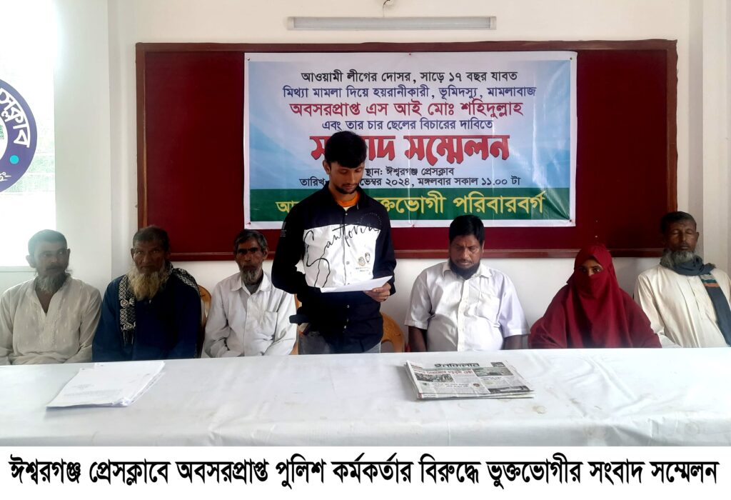 ময়মনসিংহের ঈশ্বরগঞ্জে এক অবসরপ্রাপ্ত পুলিশ কর্মকর্তা এলাকার নিরীহ মানুষদের বিরুদ্ধে মিথ্যা মামলা দিয়ে হয়রানি ও জমি জবর দখল করে নেয়ার অভিযোগ উঠেছে। মঙ্গলবার ঈশ্বরগঞ্জ প্রেসক্লাবে এক সংবাদ সম্মেলনে অভিযুক্ত পুলিশ কর্মকর্তা শহিদুল্লাহ’র সহোদর ভাই আব্দুল জব্বার সহ এলাকার প্রায় ১০/১৫ জন ভুক্তভোগী উপস্থিত হয়ে এধরণের অভিযোগ করেন।