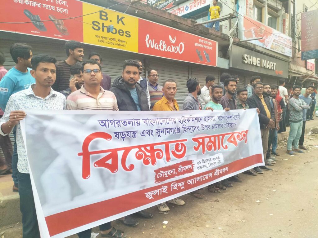 শুক্রবার বিকেলে শহরের চৌমুহনা চত্বরে জুলাই হিন্দু আল্যায়েন্স এর আয়োজনে এ বিক্ষোভ সমাবেশে বক্তব্য রাখেন লেখক ও সাংস্কৃতিক কর্মী বিকাশ দাস বাপন, সাংস্কৃতিক কর্মী নীতেশ সুত্রধর, সঞ্জয় রায় রাজু, শ্রীমঙ্গল সদর ইউনিয়নের সদস্য (মেম্বার) পিয়াস দাশ প্রমুখ। পরে একটি মৌন মিছিল করে তারা।