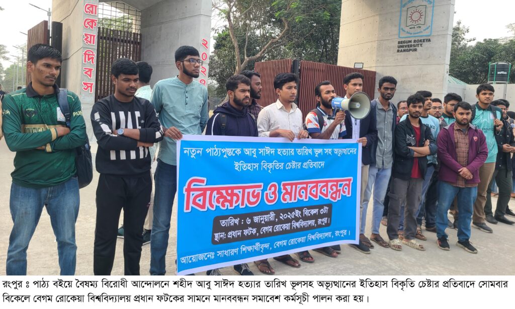 পাঠ্য বইয়ে বৈষম্য বিরোধী আন্দোলনে শহীদ আবু সাঈদ হত্যার তারিখ ভূলসহ অভ্যূত্থানের ইতিহাস বিকৃতি চেষ্টার প্রতিবাদে রংপুরে মানববন্ধন সমাবেশ হয়েছে। সোমবার (৬ জানুয়ারী) বিকেলে বেগম রোকেয়া বিশ্ববিদ্যালয়ের শিক্ষার্থীদের আয়োজনে বিশ্ববিদ্যালয় প্রধান ফটকের সামনে এ কর্মসূচীতে বিভিন্ন বিভাগের শিক্ষার্থীরা অংশ নেন। বৈষম্য বিরোধী ছাত্র আন্দোলন মহানগর শাখার সদস্য সচিব রহমত আলী’র সভাপতিত্বে এতে বক্তব্য রাখেন, শিক্ষার্থী শামসুর রহমান সুমন, মাহমুদুল হাসান আবিরসহ অন্যরা।