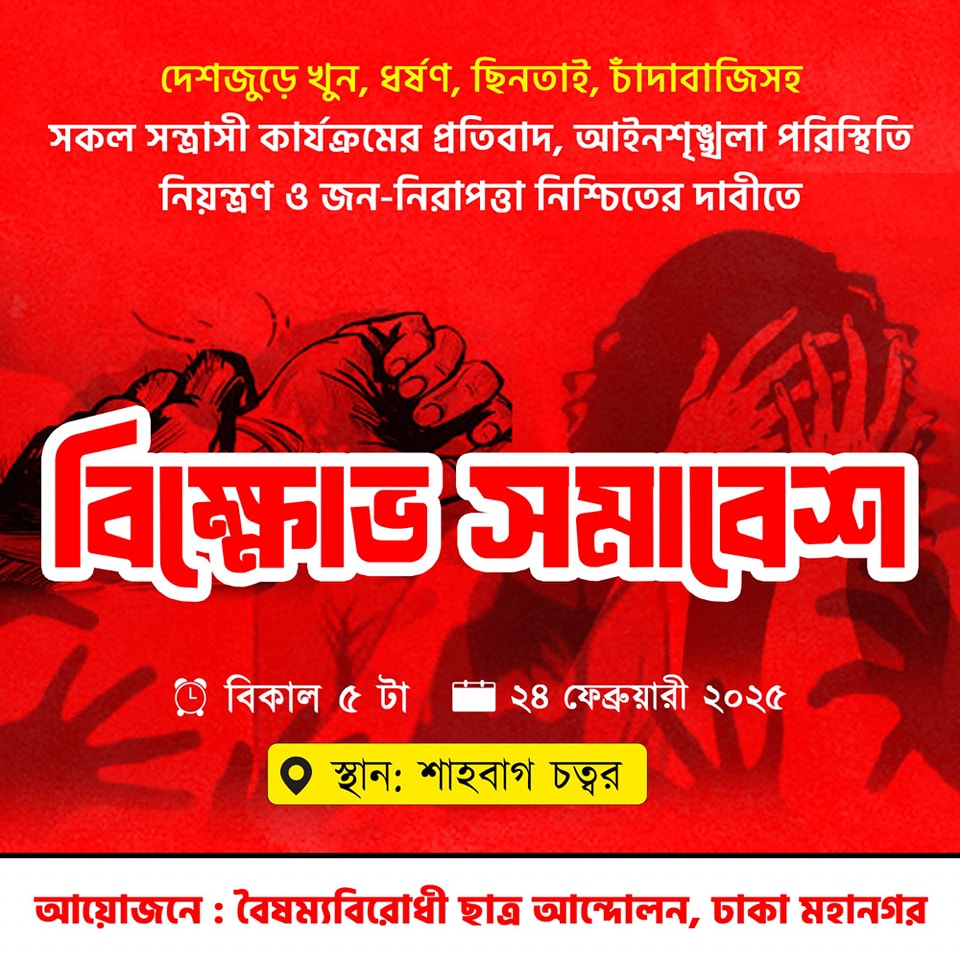 দেশজুড়ে খুন, ধর্ষণ, ছিনতাই, চাঁদাবাজিসহ সকল সন্ত্রাসী কার্যক্রমের প্রতিবাদ, আইনশৃঙ্খলা পরিস্থিতি নিয়ন্ত্রণ ও জননিরাপত্তা নিশ্চিতের দাবিতে বিক্ষোভ সমাবেশের ডাক দিয়েছে বৈষম্যবিরোধী ছাত্র আন্দোলন।