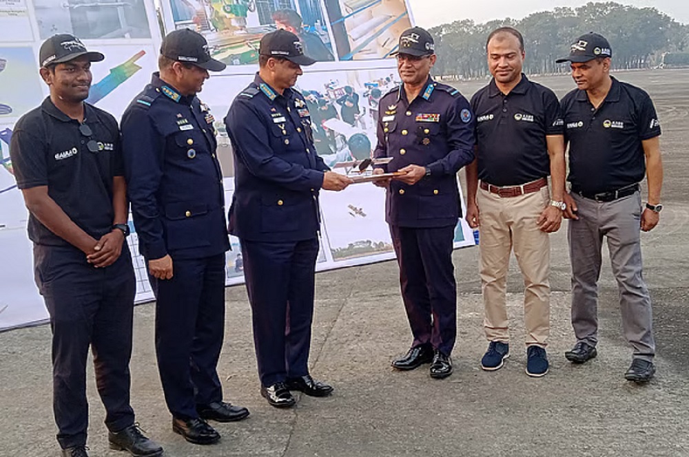 বাংলাদেশ অ্যাভিয়েশন অ্যান্ড অ্যারোস্পেস বিশ্ববিদ্যালয়ের বানানো ড্রোনের একটি রেপ্লিকা বিমানবাহিনীর প্রধান এয়ার চিফ মার্শাল হাসান মাহমুদ খানের হাতে হস্তান্তর করা হয়েছে। গতকাল মঙ্গলবার বিকেলে বিশ্ববিদ্যালয়ের লালমনিরহাট ক্যাম্পাসে ছবি: