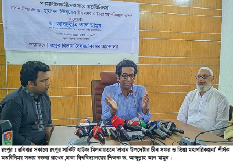 রংপুর ব্যুরো: রংপুরে চীনের অর্থায়নের চ্যালেঞ্জ বিবেচনায় তিস্তা মহাপরিকল্পনা বাস্তবায়নে বিকল্প অর্থায়নের উপর গুরুত্বারোপকরে মত বিনিময় সভা গতকাল রোববার সকালে রংপুর সার্কিট হাউজ মিলনায়তনে অনুষ্ঠিত  হয়েছে। রংপুর বিভাগ বৈষম্য নিরসন আন্দোলনের ব্যানারে ‘প্রধান উপদেষ্টার চীন সফর ও তিস্তা মহাপরিকল্পনা’ শীর্ষক মত বিনিময় সভায় এ তাগিদ দেন ঢাকা বিশ^বিদ্যালয়ের শিক্ষক ডক্টর আব্দুল্লাহ আল মামুন।