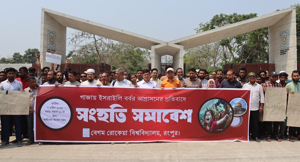 সংহতি সমাবেশে অন্যান্যের মধ্যে প্রকৌশল ও প্রযুক্তি অনুষদের ডিন প্রফেসর ড. মোঃ মিজানুর রহমান, রেজিস্ট্রার ড. মোঃ হারুন-অর রশিদ, ছাত্র পরামর্শ ও নির্দেশনা দপ্তরের পরিচালক প্রফেসর ড. মোঃ ইলিয়াছ প্রামানিক, বেরোবি কেন্দ্রীয় মসজিদের খতিব রকিব উদ্দিন আহাম্মেদসহ বিভিন্ন বিভাগের শিক্ষার্থীবৃন্দ বক্তব্য রাখেন। বক্তারা তাঁদের বক্তব্যে ইসরাইলের বর্বরতম আগ্রাসন কার্যকর প্রতিরোধ গড়ে তুলতে দেশব্যাপী ইসরাইলি পণ্য বর্জন, ইহুদিদের অর্থনৈতিক অবরোধ প্রদান, অবিলম্বে ফিলিস্তিন রাষ্ট্রকে স্বীকৃতি দেয়ার জোর দাবি জানান । উল্লেখ্য, গাজায় ইসরাইলি বাহিনীর নৃশংস হামলার প্রতিবাদে শিক্ষার্থীদের বিশ্বব্যাপী ক্লাস ও পরীক্ষা বর্জন কর্মসূচির সঙ্গে সংহতি প্রকাশ করে বেগম রোকেয়া বিশ্ববিদ্যালয় প্রশাসন সোমবার বিশ্ববিদ্যালয়ের সকল ক্লাস ও পরীক্ষা স্থগিত ঘোষণা করে।
