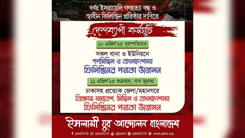 বর্বর ইসরায়েলি গণহত্যা বন্ধ ও স্বাধীন ফিলিস্তিন প্রতিষ্ঠার দাবিতে ইসলামী যুব আন্দোলনের দুই দিনের কর্মসূচি ঘোষণা