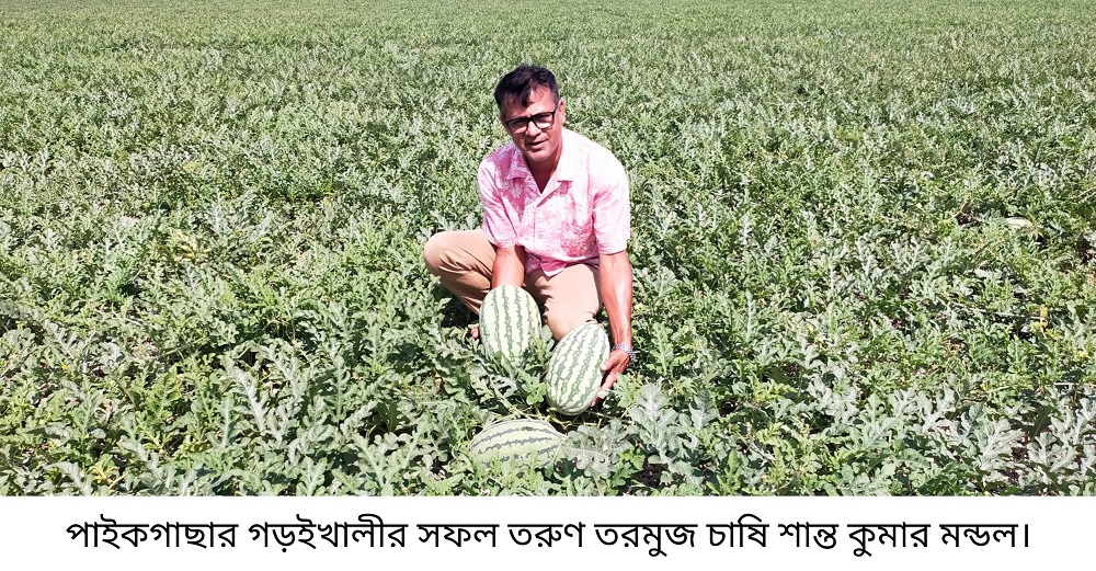 মাসুম বিল্লাহ ইমরান, খুলনা: তরমুজ রবি মৌসুমের একটি ফসল। এটি সুস্বাদু একটি ফল। বাজারে এর চাহিদা ও রয়েছে বেশ। এর উৎপাদন খরচ অনেক কম এবং অল্প দিনেই বাজারজাত করা যায়। এজন্য অন্যান্য ফসলের তুলনায় তরমুজ চাষ অনেক বেশি লাভজনক। এ কারণে উপকূলীয় খুলনার পাইকগাছায় প্রতিবছর বাড়ছে তরমুজের আবাদ। কোটি কোটি টাকার উৎপাদিত তরমুজ স্থানীয় চাহিদা পূরণ করে সরবরাহ করা হয় দেশের বিভিন্ন স্থানে। কৃষি সম্প্রসারণ অধিদপ্তরের তথ্য অনুযায়ী চলতি মৌসুমে অত্র উপজেলায় ২ হাজার ১৪০ হেক্টর জমিতে তরমুজের আবাদ হয়েছে। যা বিগত বছরের চেয়ে ৭’শ হেক্টর বেশি। প্রতিবছর তরমুজ চাষের সাথে যুক্ত হচ্ছে এলাকার শিক্ষিত বেকার যুবকরা। পতিত এবং ফেলে রাখা জমিতে তরমুজ চাষ করে অর্থনৈতিক ভাবে ঘুরে দাঁড়াচ্ছে বেকার যুবকরা সহ বিভিন্ন পর্যায়ের তরমুজ চাষিরা। এসকল সফল তরমুজ চাষিদের তালিকায় রয়েছে শান্ত কুমার মন্ডল। এবছর তিনি ২৫ বিঘা জমিতে তরমুজের আবাদ করেছেন। বাম্পার ফলন ও হয়েছে। তবে খাল খনন, বিদ্যুৎ ও যোগাযোগ ব্যবস্থার উন্নয়ন করার মাধ্যমে তরমুজ চাষ ব্যবস্থা কে সহজ করতে পারলে তরমুজ চাষ আরো বৃদ্ধি পাবে এবং এর মাধ্যমে এলাকার আর্থসামাজিক উন্নয়ন ঘটবে বলে আশা করছেন তরমুজ চাষীরা।