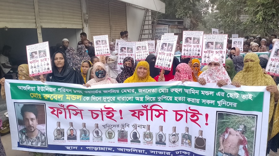 বৃহস্পতিবার বাদ আসর আশুলিয়ার পাড়াগ্রাম এলাকায় জানাজা শেষে এই মানববন্ধন করেন তারা। এসময় রুবেল মন্ডলকে হত্যার সাথে জড়িতদের দ্রুত আইনের আওতায় এনে ফাঁসির দাবি জানানো হয়।
