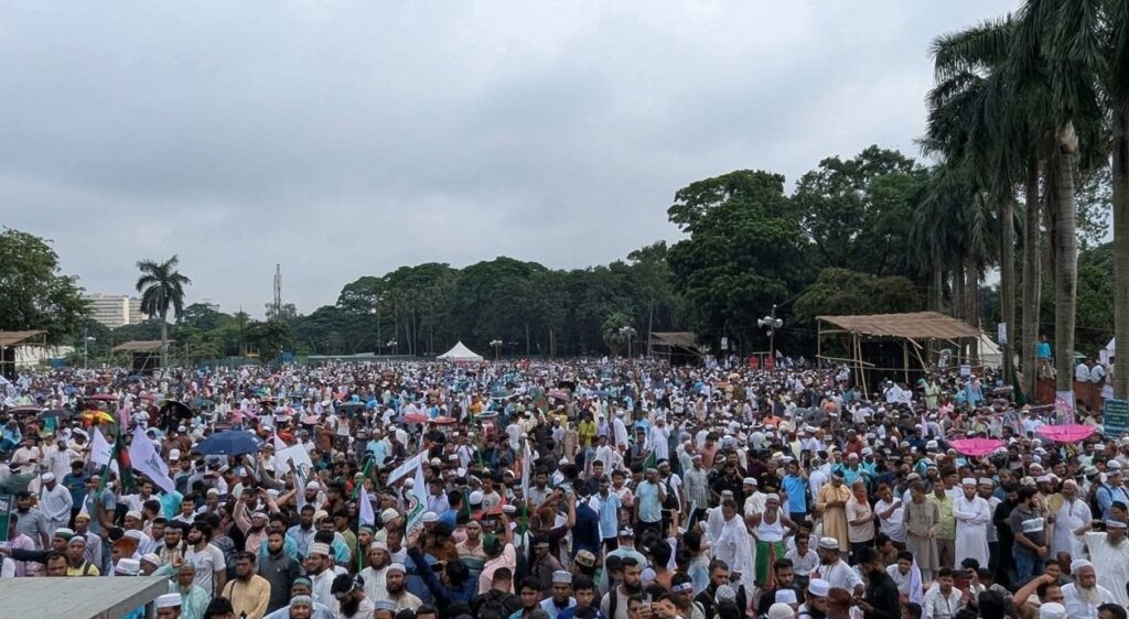 সাত দফা দাবিতে রাজধানীর ঐতিহাসিক সোহরাওয়ার্দী উদ্যানে জামায়াতে ইসলামী আয়োজিত জাতীয় সমাবেশে লাখ লাখ মানুষের ঢল নেমেছে। সমাবেশ শুরুর ৬ ঘণ্টা আগেই দলটির নেতাকর্মী ও সমর্থকদের উপস্থিতিতে প্রায় কানায় পরিপূর্ণ হয়ে গেছে সোহরাওয়ার্দী উদ্যান। এছাড়া সোহরাওয়ার্দী উদ্যানের বাইরেও অবস্থান করছেন হাজার হাজার নেতাকর্মী।