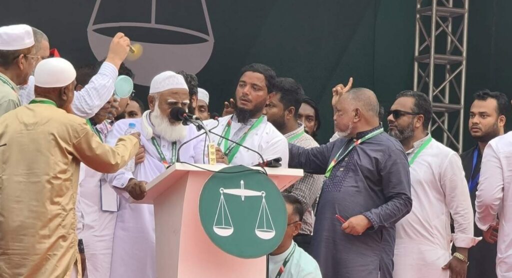জামায়াতে ইসলামীর আমির ডা. শফিকুর রহমান বক্তব্যের মাঝে হঠাৎ মঞ্চে পড়ে যান। কিছুক্ষণ পর উঠে দাঁড়িয়ে বক্তব্য দিতে গিয়ে আবারও ঢলে পড়েন জামায়াতের আমির। এর কিছুক্ষণ পর তিনি সমাবেশ মঞ্চে বসেই বক্তব্য দেন।