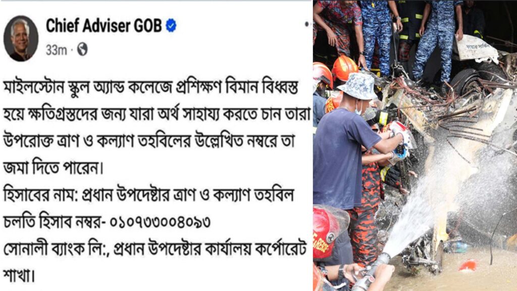 ওই পোস্টে লেখা হয়, “মাইলস্টোন স্কুল অ্যান্ড কলেজে প্রশিক্ষণ বিমান বিধ্বস্ত হয়ে ক্ষতিগ্রস্তদের জন্য যারা অর্থ সাহায্য করতে চান তারা উপরোক্ত ত্রাণ ও কল্যাণ তহবিলের উল্লেখিত নম্বরে তা জমা দিতে পারেন।”