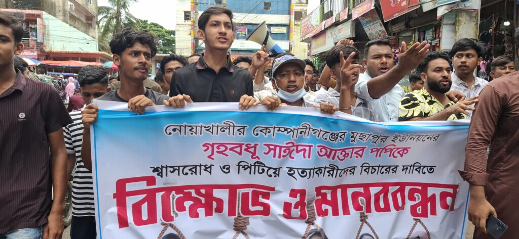 নোয়াখালীর কোম্পানীগঞ্জে যৌতুকের জন্য গৃহবধূ সাঈদা আক্তার পপি (২৫) হত্যার বিচার দাবিতে মানববন্ধন ও বিক্ষোভ করেছেন এলাকার বাসিন্দারা।।