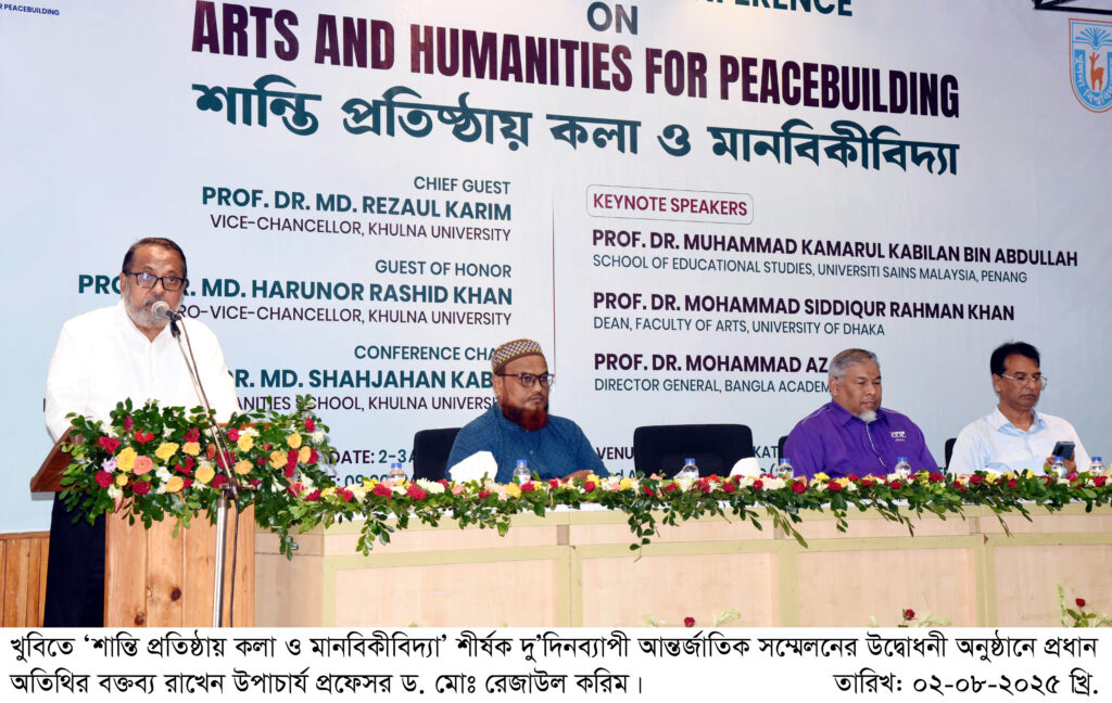 খুলনা বিশ্ববিদ্যালয়ের কলা ও মানবিক স্কুলের উদ্যোগে ‘শান্তি প্রতিষ্ঠায় কলা ও মানবিকীবিদ্যা’ শীর্ষক দু’দিনব্যাপী আন্তর্জাতিক সম্মেলন শুরু হয়েছে। আজ ০২ আগস্ট (শনিবার) সকালে বিশ্ববিদ্যালয়ের সাংবাদিক লিয়াকত আলী মিলনায়তনে এ সম্মেলনের উদ্বোধনী অনুষ্ঠানে প্রধান অতিথি হিসেবে বক্তব্য রাখেন উপাচার্য প্রফেসর ড. মোঃ রেজাউল করিম।