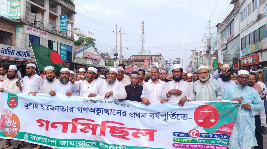 জুলাই-আগস্ট’২৪ এর ছাত্রজনতার গণঅভ্যুত্থানের বর্ষপূর্তি উপলক্ষে জয়পুরহাট জেলা জামায়াতের আয়োজনে মঙ্গলবার বিকেলে আবুল কাশেম ময়দানে থেকে বিশাল এক গণ মিছিল বের হয়ে শহরের প্রধান প্রধান সড়ক প্রদক্ষিন শেষে পাচুর মোড়ে সমাবেশ অনুষ্ঠিত হয়।