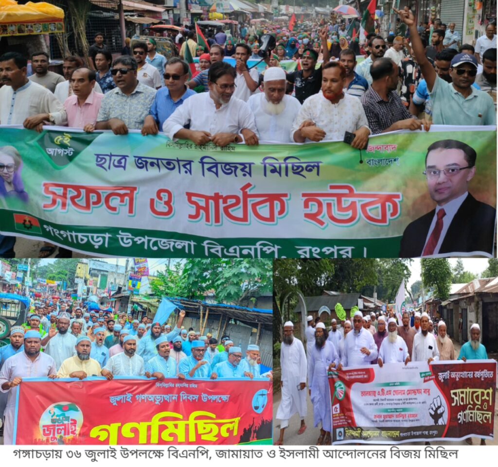 ছাত্রদের কোটা আন্দোলন থেকে রাজাকার শ্লোগানে মুখরিত যখন তখন ফ্যাসিবাদ খুনি হাসিনার নির্দেশে তার পোষাবাহিনীর নির্বিচারে গুলি ও তার দলের নেতাকর্মী এবং দোসরদের হাতে আন্দোলন কারী নিরহ ছাত্রদের হত্যা প্রতিবাদে ক্ষীপ্ত জনতা ও ফ্যাসিবাদ বিরোধী রাজনৈতিক দলের নেতাকর্মী, সমর্থক এবং অভিভাবক ছাত্রদের আন্দোলনে যোগদিয়ে ফ্যাসিবাদ হাসিনার পতনের একদফা দাবিতে আন্দোলন আরো দেশব্যাপী বেগবান করে তুলে। রাজনৈতিক দলের দায়িত্বশীলগণ ও ছাত্র সমন্বনয়করা দেন আন্দোলন চালিয়ে যাওয়ার দিকনির্দেশনা বানী। শত শত মায়ের বুক খালি করে, স্ত্রী হয় স্বামী হারা, ছেলেকে করে পিতা হারা, পিতাকে সন্তান হারা করেও যখন রুখতে পারেনা ছাত্র-জনতার আন্দোলন, তখন ফ্যাসিবাদ ও তার দোসরা দিশেহারা হয়ে পড়ে এবং ফ্যাসিবাদের প্রধান হাসিনা ৩৬ জুলাই (৫ আগস্ট) ফ্যাসিবাদী ক্ষমতা ছেড়ে ভারতে পালিয়ে যায়। আর এ দিনটি নতুন বাংলাদেশ হিসেবে রুপ নেয় এবং এ দিনটি ঐতিহাসিক দিন হিসেবে ছাত্র-জনতার গণঅভ্যুত্থানের দিন তথা আরেকটা বিজয়ের দিন। স্বরণীয় এ দিনটি একটি বছর পর ফিরে এসেছে। বেদনার মাঝেও বিজয়ের হাসি ফুটানো এ দিনটি সারাদেশ ফ্যাসিবাদ বিরোধী রাজনৈতিক দল, ছাত্র-জনতা আনন্দের বিজয় মিছিল করেছে। গঙ্গাচড়ায় বিএনপি, জামায়াতে ইসলামী, ইসলামী আন্দোলন ও সর্বস্তরের জনতা পৃথক পৃথক ভাবে মঙ্গলবার বিজয় মিছিল করেছে। গঙ্গাচড়া উপজেলা বিএনপির উদ্যোগে ডাকবাংলো মাঠ থেকে বিকাল সাড়ে ৩ টায় একটি বিরাট বিজয় মিছিল বের করে। মিছিল গঙ্গাচড়ার গুরুত্বপূর্ণ সড়ক প্রদক্ষিণ করে। এ সময় উপজেলা বিএনপির সভাপতি চাঁদ সরকার, সাধারণ সম্পাদক আইয়ুব আলী, জেলা বিএনপির সদস্য ওয়াহেদুজ্জামান মাবু, আখেরুজ্জামান মিলন, উপজেলা বিএনপির সিনিয়র সহ-সভাপতি শফিকুল ইসলাম চান, যুগ্ন সাধারণ সম্পাদক বেলাল প্রামানিক, সাংগঠনিক সম্পাদক আপেল মাহমুদ, মিজানুর রহমান লুলু, কেন্দ্রীয় জাতীয়তাবাদী প্রচার দলের সহ-সভাপতি রুহুল ইসলাম, উপজেলা যুবদলের আহবায়ক সাজু আহম্মেদ স্বপন, সদস্য সচিব শাহিন আলম সোনা, ছাত্র দলের আহবায়ক তিতাস, সিনিয়র যুগ্ম আহবায়ক আশিক, সদস্য সচিব কাফী, স্বেচ্ছাসেবক দলের আহবায়ক রঞ্জু, সদস্য বুলবুল, কৃষক দলের আহবায়ক বিএনপি সবুজ, সদস্য সচিব শহিদুল ইসলাম, শ্রমিক দলের আহবায়ক মজমুল, সদস্য সচিব সাদ্দাম, মহিলা দলের সভানেত্রী তৃষনা, সাধারণ সম্পাদীকা রিনা, মৎস্যজীবি দলের সভাপতি জামান কাচু, সাধারণ সম্পাদক মাসুদ, তাতী দলের সভাপতি হাসান, সাধারণ সম্পাদক মিজানুর রহমান, হিন্দু, বৌদ্ধ, খ্রীস্টান ঐক্য কল্যাণ ফ্রন্টসহ উপজেলা, ইউনিয়ন ও ওয়ার্ড বিএনপি, অঙ্গ সহযোগী সংগঠনের নেতাকর্মী, সমর্থক বিজয় মিছিল অংশগ্রহণ করে। এদিকে উপজেলা জামায়াতে ইসল