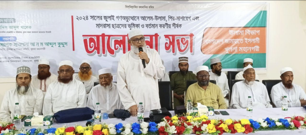 খুলনা মহানগরীর উলামা বিভাগের সভাপতি মাওলানা আ ন ম আব্দুল কুদ্দুস এর সভাপতিত্বে ও সেক্রেটারি মাওলানা মুহাদ্দিস আবু বকর সিদ্দিক এর পরিচালনায় বিশেষ অতিথি ছিলেন বাংলাদেশ জামায়াতে ইসলামীর কেন্দ্রীয় মজলিসে শূরা সদস্য খুলনা মহানগরী আমীর অধ্যাপক মাহফুজুর রহমান। সভায় আলোচনা করেন ও উপস্থিত ছিলেন খুলনা জেলা ইমাম পরিষদের সাধারণ সম্পাদক ও দারুল উলুম কওমী মাদরাসার সিনিয়র শিক্ষক মাওলানা মো. গোলাম ক্বিবরিয়া, ইমাম পরিষদের যুগ্ম সাধারণ সম্পাদক ও দারুল উলুম কওমী মাদরাসার হেড মুহাদ্দিস মাওলানা নাসির উদ্দীন কাসেমী, খুলনা আলিয়া কামিল মাদরাসার অধ্যক্ষ মাওলানা ড. আব্দুর রহিম, ইমাম পরিষদের যুগ্ম সাধারণ সম্পাদক তালিমুল মিল্লাত রহমানিয়া ফাযিল মাদরাসার অধ্যক্ষ মাওলানা এ এফ এম নাজমুস সউদ, খুলনা নেছারিয়া কামিল মাদরাসার ভাইস প্রিন্সিপাল মাওলানা মো. ডি এম নুরুল ইসলাম, অধ্যক্ষ মাওলানা মো. জাফর সাদিক আনসারী , বিশিষ্ট মুফাস্সির ও ওয়ায়েজিন মাওলানা মো. আব্দুল গফ্ফার, খুলনা সদর থানা সভাপতি ডা. হাফেজ মাওলানা মো. সাইফুল্লাহ মানসুর, সোনাডাঙ্গা থানা সভাপতি মাওলানা মো. সফির উদ্দিন, খালিশপুর থানা সভাপতি মাওলানা মো. শাহজাহান আলম, দৌলতপুর থানা সভাপতি মাওলানা হাবিবুর রহমান, লবণচরা থানা সভাপতি মাওলানা গাজী আল আমিন, আড়ংঘাটা থানা সভাপতি মাওলানা মো. মেহদি হাসান, সদর থানা সেক্রেটারি মাওলানা মো. জাহিদুল হক, মাওলানা আব্দুর রহিম, মাওলানা নূর সাঈদ জালালী, মাওলানা রফিকুল ইসলাম, ছাত্র প্রতিনিধি মাওলানা মো. নাঈমুল ইসলাম, জুলাই আহত যোদ্ধা মো. রেদওয়ানুল হক, খুলনা আলিয়া মাদরাসার ছাত্রশিবির সভাপতি মো. শিবলুর রহমান প্রমুখ।
