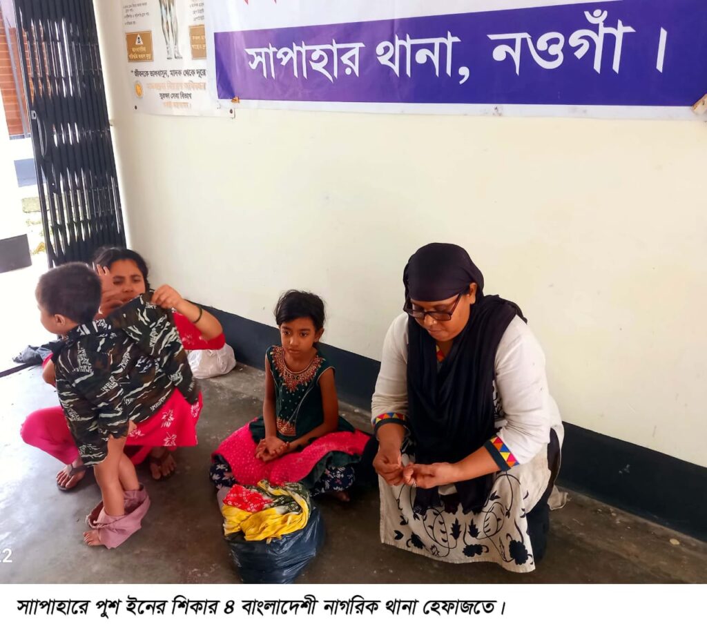 নওগাঁর সাপাহার সীমান্ত দিয়ে ভারতে বসবাসকারী ৪জন বাংলাদেশী নাগরিককে পুশইন করেছে বিএসএফ। পুশ ইনের শিকার নাগরিকরা হচ্ছে নড়াইল জেলার উথলি গ্রামের মো: ইমদাদুল হকের স্ত্রী মোছা: হেনা খাতুন (৩৮) এবং একই জেলার চাঁনপুর গ্রামের বালাম শিকদারের স্ত্রী মোছা: রুপালী খাতুন (৩৫) তারই সন্তান মোছা: চাঁদনী (০৮) ও মো: রমজান (২.৫) (আড়াই বছর)।