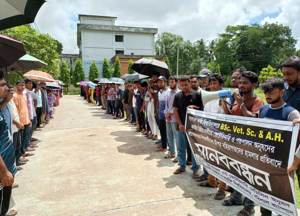 বাংলাদেশ কৃষি বিশ্ববিদ্যালয়ের(বাকৃবি) ভেটেরিনারি ও এনিমেল হাজব্যান্ড্রি অনুষদের আন্দোলনরত শিক্ষার্থীদের উপর বহিরাগতদের ওপর হামলার প্রতিবাদে মানববন্ধন ও বিক্ষোভ কর্মসূচি পালন করেছেন বরিশালের বাবুগঞ্জস্থ পটুয়াখালী বিজ্ঞান ও প্রযুক্তি বিশ্ববিদ্যালয়ের (পবিপ্রবি) শিক্ষার্থীরা। মঙ্গলবার (২ সেপ্টেম্বর) বেলা ১১টায় ক্যাম্পাসের একাডেমি ভবনের সামনে মানববন্ধন শেষে বিক্ষোভ মিছিল করে ভবনের সামনে এক সংক্ষিপ্ত বক্তব্যের মধ্য দিয়ে শেষ হয়। বক্তারা বলেন,শিক্ষার্থীদের ন্যায্য দাবিতে আন্দোলন চলাকালে বহিরাগতদের হামলা অত্যন্ত নিন্দনীয় ও অগ্রহণযোগ্য। শিক্ষার্থীরা তাদের অধিকার আদায়ের জন্য শান্তিপূর্ণ আন্দোলন করছিল। সেখানে হামলা করে তাদের ওপর যে বর্বরতা চালানো হয়েছে, তার তীব্র নিন্দা জানাই। এসময় হামলার বিচার না হলে এবং বাকৃবি শিক্ষার্থীদের ন্যায্য দাবি মেনে নেওয়া না হলে বৃহত্তর আন্দোলন কর্মসূচির হুঁশিয়ারি দেন বিক্ষোভকারী শিক্ষার্থীরা। মানববন্ধন বক্তব্য রাখেন চতুর্থ বর্ষের শিক্ষার্থী আব্দুল্লাহ হিল কাফি, সুজন মৃধা হাওলাদার, জাওয়াদুল ইসলাম জামিন, রুশমিলা জাহান রুপা, দ্বিতীয় বর্ষের শাহরিয়ার ইসলাম রাফি, অর্জুন দাশ এবং মুজাহিদুল ইসলাম তন্ময় প্রমুখ। মানববন্ধনে ভেটেরিনারি ও পশুপালন অনুষদের শতাধিক শিক্ষার্থী অংশগ্রহণ করেন।