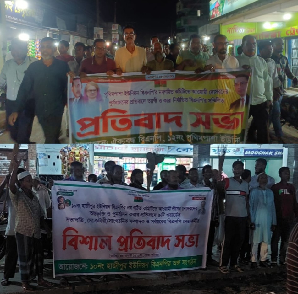 এদিকে শনিবার রাতে হাজীপুর ইউনিয়নের কটারকোনা বাজারে আয়োজিত প্রতিবাদ সভায় বিভিন্ন ওয়ার্ডের সভাপতি, সাধারণ সম্পাদক, সাংগঠনিক সম্পাদকসহ ২০১৮ সালে কারা নির্যাতিত নেতাকর্মীরা বক্তব্য রাখেন। নেতাকর্মীদের অভিযোগ, ইউনিয়ন কমিটির সভাপতি ইয়াকুব আলী ও সাধারণ সম্পাদক মনিরুজ্জামান হেলাল টাকার বিনিময়ে আওয়ামীলীগের পদবীধারী নেতাদের কমিটিতে সুযোগ করে দিয়েছেন। জাতীয় শ্রমিকলীগ হাজীপুর ইউনিয়ন শাখার সহ-সভাপতি কনা মিয়া কর্ণেলকে ইউনিয়ন বিএনপির শ্রম বিষয়ক সম্পাদকের দায়িত্ব দেয়া হয়। আওয়ামীলীগের দোসর তারেক আহমদকে ইউনিয়ন বিএনপির যুগ্ম সাধারণ সম্পাদক ও জুনাব আলী তালুকদারকে সহ-প্রচার সম্পাদকের দায়িত্ব দেয়া হয়েছে। ওই কমিটিতে ইউনিয়নের অনেক ত্যাগী নেতাদের মূল্যায়ন করেননি। পরে একটি ঝাড়ু মিছিল বাজার প্রদক্ষিণ করে।