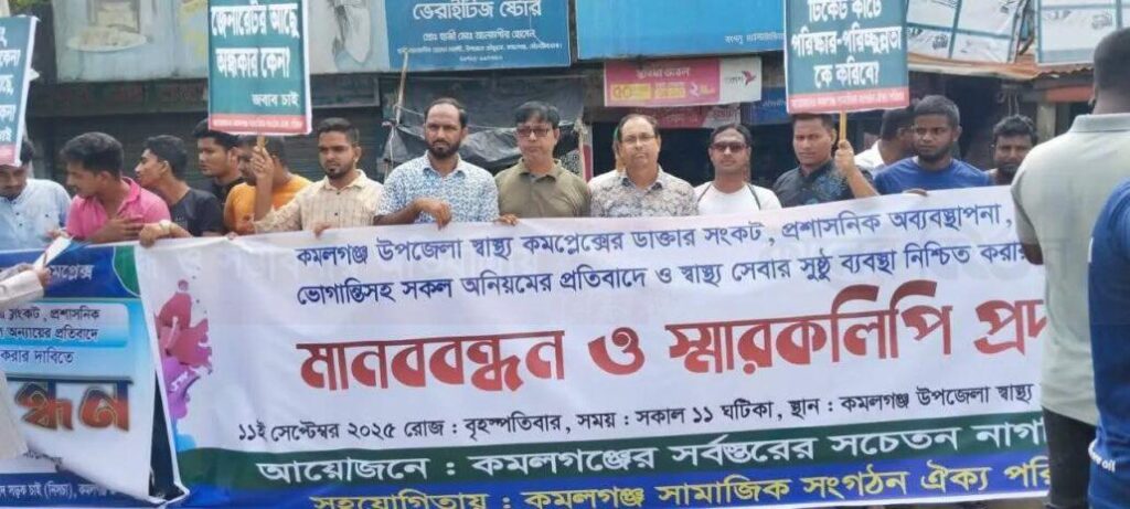বৃহস্পতিবার (১১ সেপ্টেম্বর) দুপুরে উপজেলা স্বাস্থ্য কমপ্লেক্সের সামনে কমলগঞ্জ সামাজিক সংগঠন ঐক্য পরিষদের আয়োজনে এ মানববন্ধন অনুষ্ঠিত হয়।