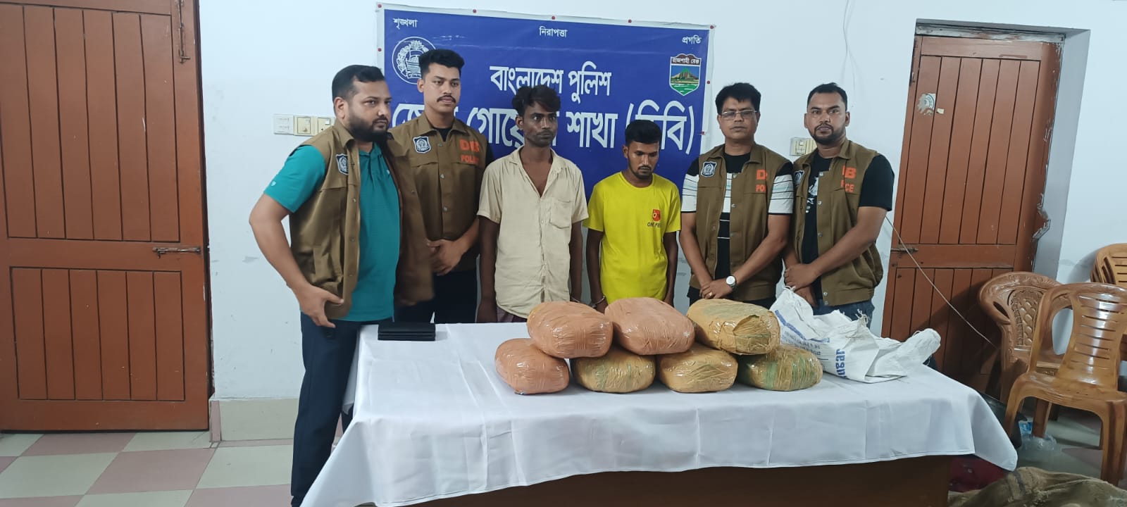 প্রেসব্রিফিংয়ে জানানো হয়, গোয়েন্দা তথ্যের ভিত্তিতে রবিবরা ভোরে নাটোর শহরের বনবেলঘরিয়া বাইপাস এলাকায় চেকপোস্ট বসিয়ে অভিযান চালায় জেলা গোয়েন্দা শাখা (ডিবি) পুলিশের একটি দল। এসময় নোয়াখালী হতে চাঁপাইনবাবগঞ্জগামী যাত্রীবাহী বাস গ্রামীণ ট্রাভেলস্কে (ঢাকা-মেট্রো-ব-১৫-৮৫৪০) সংকেত দিয়ে থামিয়ে তল্লাশি চালিয়ে যাত্রী সিটের পায়ের নিচে থেকে পৃথক দুই বস্তায় ১৪ কেজি গাঁজা জব্দ করাসহ ওয়াদুদ আলী (২৫), ফসের আলী @ সোহেলকে গ্রেফতার করা হয়।