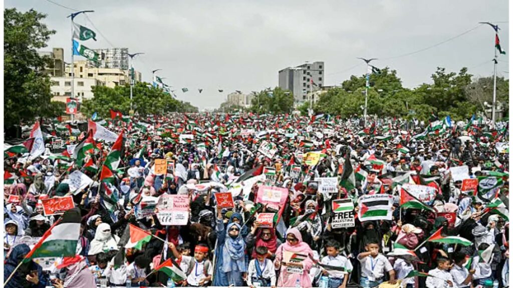 ফিলিস্তিনে ইসরায়েলের চলমান আগ্রাসনের প্রতিবাদে পাকিস্তানের করাচিতে বিশাল বিক্ষোভ অনুষ্ঠিত হয়েছে। বৃহস্পতিবার (১৮ সেপ্টেম্বর) আয়োজিত এই কর্মসূচিতে অংশ নেন হাজারো মানুষ। শিক্ষার্থী, শিক্ষক, রাজনৈতিক দলের নেতা-কর্মীসহ বিভিন্ন শ্রেণি-পেশার মানুষ এতে যোগ দেন।