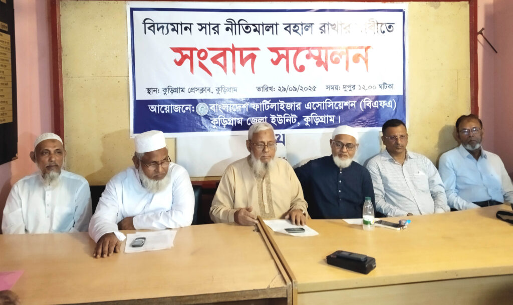 দেশে বিদ্যমান সার নীতিমালা বহাল রাখার দাবী জানিয়ে সংবাদ সম্মেলন করেছে বাংলাদেশ ফার্টিলাইজার এসোসিয়েশন (বিএফএ) কুড়িগ্রাম জেলা শাখার নেতৃবৃন্দ।