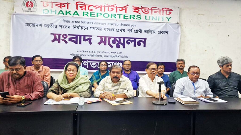আগামী জাতীয় সংসদ নির্বাচনে সবগুলো ৩০০ আসনেই প্রার্থী দেওয়ার ঘোষণা দিয়েছে ‘গণতন্ত্র মঞ্চ’। এর অংশ হিসেবে বৃহস্পতিবার (৯ অক্টোবর) সকালে ঢাকা রিপোর্টার্স ইউনিটি (ডিআরইউ) মিলনায়তনে আয়োজিত এক সংবাদ সম্মেলনে প্রথম দফায় ১৪০ আসনের প্রার্থী তালিকা প্রকাশ করে জোটটি।