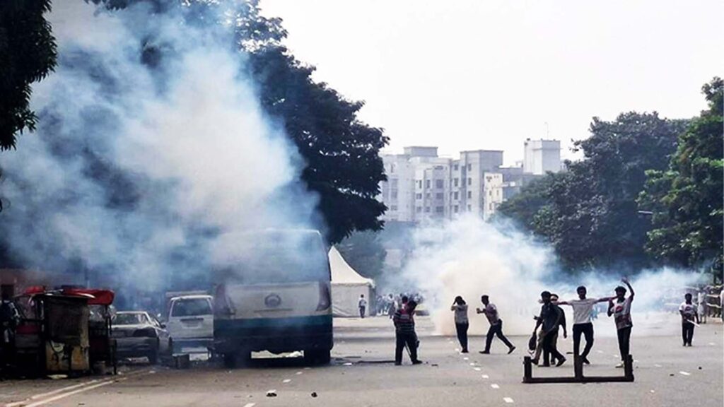সংঘর্ষ চলাকালে আন্দোলনকারীরা পুলিশকে লক্ষ্য করে বোতল ও চেয়ার নিক্ষেপ করে। পরিস্থিতি নিয়ন্ত্রণে আনতে পুলিশ সাউন্ড গ্রেনেড ও টিয়ারশেল নিক্ষেপ করে তাদের ছত্রভঙ্গ করার চেষ্টা চালায়। অপরদিকে, আন্দোলনকারীরা সড়কে আগুন ধরিয়ে ইট-পাটকেল ছোড়ে এবং পুলিশের কয়েকটি গাড়ি ভাঙচুর করে।