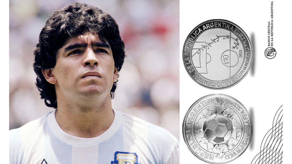 মুদ্রার এক পৃষ্ঠায় স্থান পেয়েছে ফুটবল ইতিহাসের সর্বকালের অন্যতম স্মরণীয় দৃশ্য—১৯৮৬ মেক্সিকো বিশ্বকাপে ইংল্যান্ডের বিপক্ষে ম্যারাডোনার সেই বিখ্যাত ‘গোল অব দ্য সেঞ্চুরি’। মাঝমাঠ থেকে বল নিয়ে টানা পাঁচ ডিফেন্ডারকে ড্রিবলিংয়ে পরাস্ত করে গোলটি করেছিলেন আলবিসেলেস্তাদের অধিনায়ক। আগামী বছর সেই ঐতিহাসিক গোলের ৪০ বছর পূর্ণ হবে।